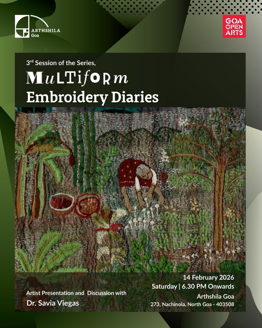 Embroidered Diaries was a talk given by Dr. Savia Viegas at Artshila, Goa, where one spent the evening listening to her speak about her embroidered narratives — works that hold village stories, whispered histories, remembered scandals, and impossible romances drawn from dining-table conversations of her childhood.